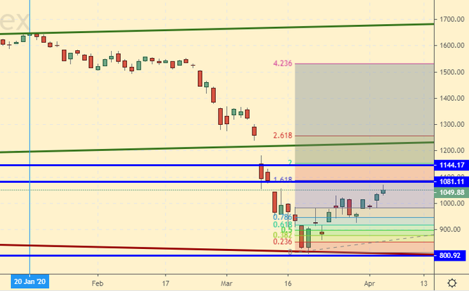 Сценарий роста: выше 1080 рынок не виден, так как нам нужно восстановление цен на нефть, а его не будет, так как спрос на топливо продолжит падать в апреле, это уже ясно всем. Если как-то мы поднимемся сейчас к 1250, что будет явным перебором, то май будет просто адским: быстро пойдем на 600.0.