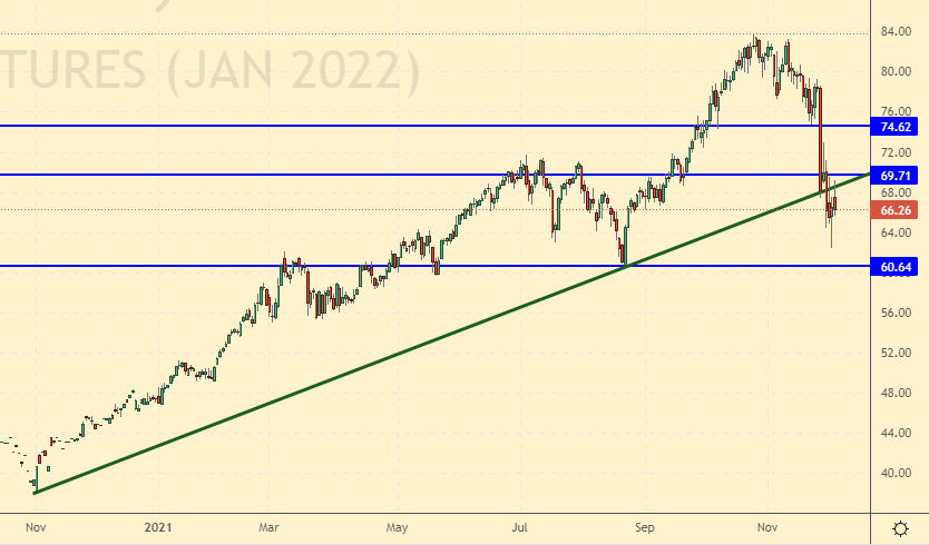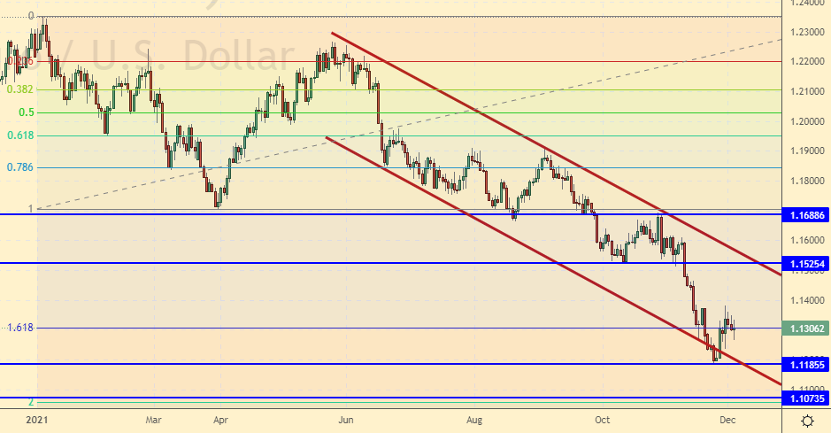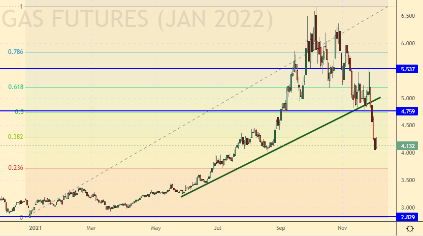 Судя по тому, как быстро затухают страхи по штамму «омикрон» на нефть не будет оказываться давление со стороны пандемии. Нельзя исключать, что цены упадут до уровня 60.00 долларов за баррель нефти марки Brent, но более низкие уровни вряд ли будут достигнуты, так как если это произойдет ОПЕК+ наверняка сократит предложение на рынке. И придется тем, кому повезло родиться внутри золотого миллиарда уповать на то, чтобы в сильный мороз был хоть какой-то ветер, и это не шутка. Если зимой встанут ветряные генераторы, то Лондон и Париж рискуют замерзнуть.