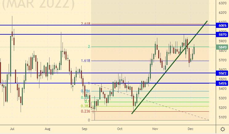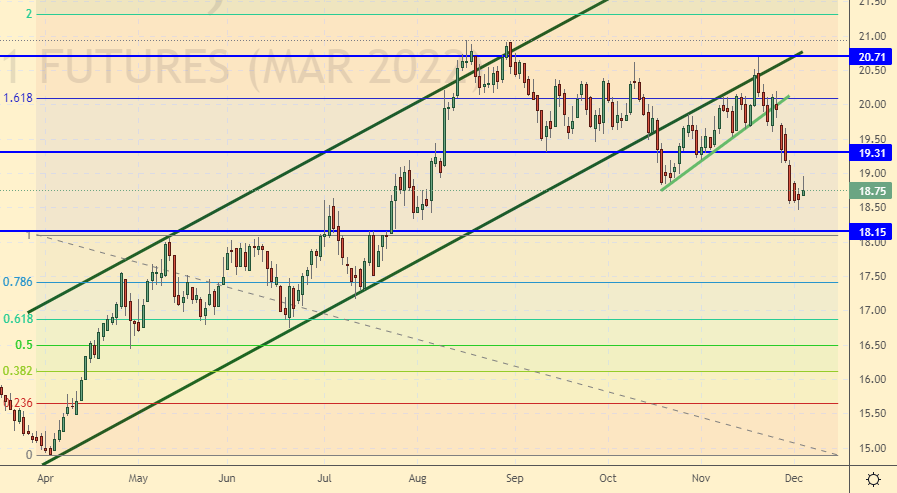 Сценарий роста: рассматриваем декабрьский фьючерс, дата экспирации 31 декабря. Продолжим отказываться от покупок. Неплохим уровнем для входа в лонг будет уровень 60.00, но только после появления признаков разворота вверх.