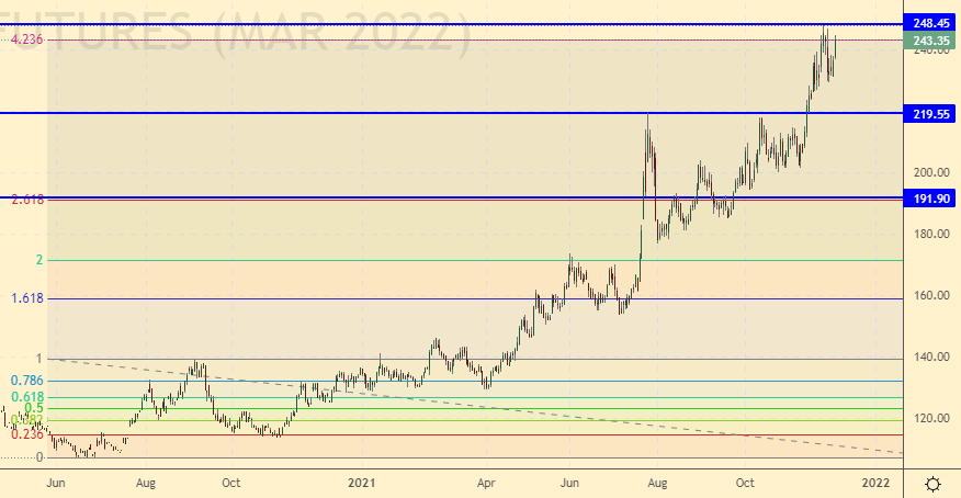 Сценарий роста: рассматриваем мартовский фьючерс, дата экспирации 21 марта. Покупать мы тут не будем. Цены слишком высоко. Всех с профитом, взяли движение от 192.00 до 244.00 центов за фунт.