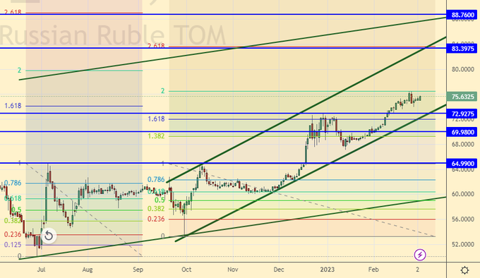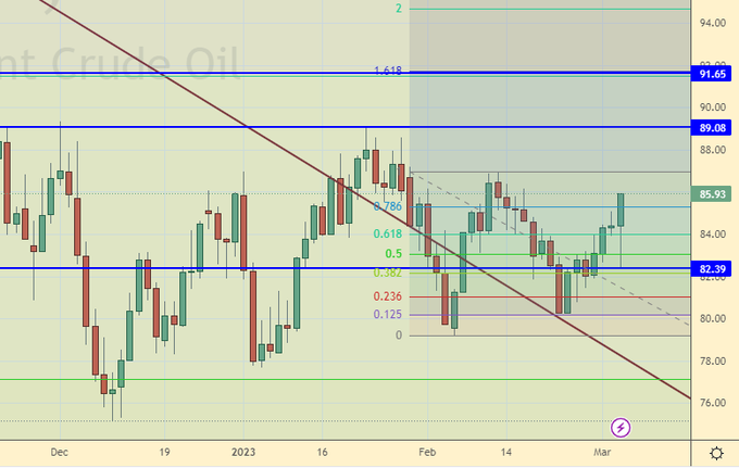 Объединенные Арабские Эмираты рассматривают возможность выхода из сделки ОПЕК+. Скорее всего это просто вброс дабы прощупать почву, но то, что ранее нами лишь предполагалось, сейчас приобретает очертания: за выпадающие объемы российской нефти начинается борьба. Если Россия в марте сокращает поставки на 0.5 млн. баррелей в сутки, то их можно кому-то и нарастить без вреда для системы. Но для того, чтобы можно было выдать на рынок как можно больше, без обсуждения вопроса о квотах и долях с другими участниками, из этого самого соглашения надо выходить. Если сделка о сокращении добычи рассыпется, то это может привести к падению цен. Однако, на практике разворота вниз мы не видим. Большинство ждет, что весной проснется китайский дракон и начнет потреблять много топлива.