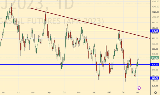 Сценарий роста: рассматриваем апрельский фьючерс, дата экспирации 12 апреля. Держим покупку от 800.0. В случае роста выше 920.0 можно добавить к лонгам.