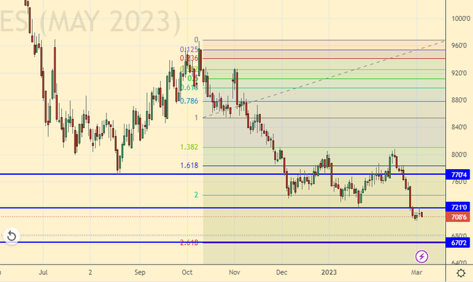 Продажа: нет. Кто в позиции от 688.0, перенесите стоп на 683.0. Цель: 580.0 (550.0) центов за бушель.