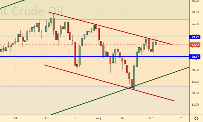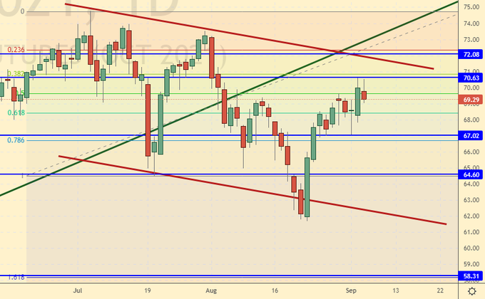 Сценарий роста: рассматриваем октябрьский фьючерс, дата экспирации 12-е октября. Понятно, что ураган «Ида» в США вынудил остановиться ряд нефтеперерабатывающих заводов в Луизиане. Тем не менее, продолжение роста цен не выглядит обязательным.