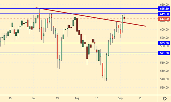 Сценарий падения: продолжаем держать шорт от 584.0. Отметки 500.0, 475.0 и 450.0 не отвергаем. Прогнозы по кукурузе на текущий сезон благоприятны.