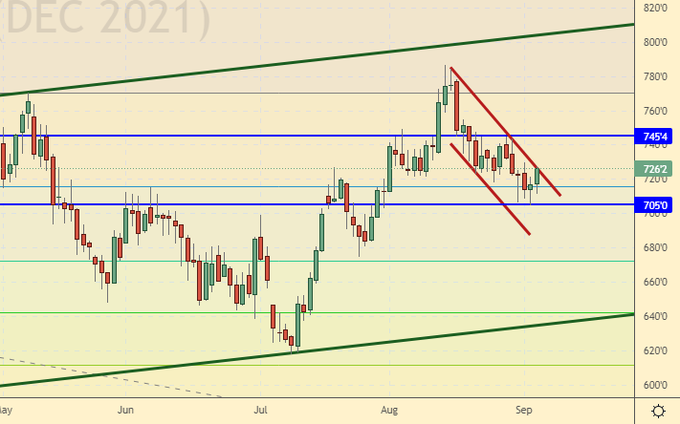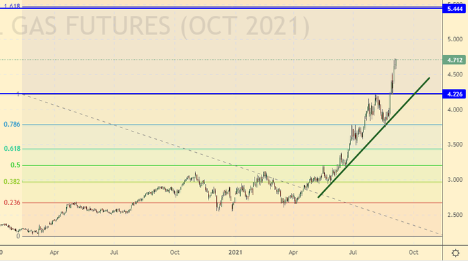 Сценарий роста: рассматриваем октябрьский фьючерс, дата экспирации 28 сентября. Цены на газ скорее всего продолжат рост так как Европа сейчас крайне уязвима перед наступлением нового сезона холодов с полупустыми хранилищами. Не исключено, что «Газпром» пока придержит поставки в ЕС, дабы заставить евробюрократов сидеть на месте и не мешать завершению «Северного потока – 2».