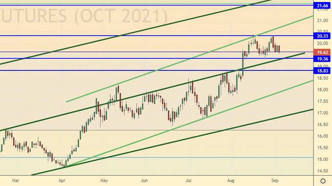 Сценарий падения: в случае падения ниже 19.35 – продать. Цены могут уйти к нижней границе агрессивного восходящего канала в район 18.00.