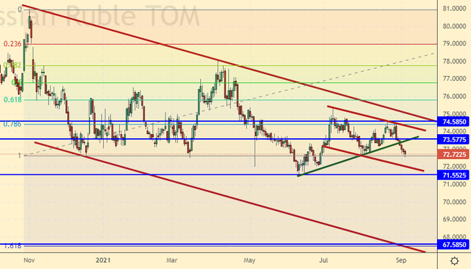 Сценарий роста: рассматриваем сентябрьский фьючерс, дата экспирации 30 сентября. Думать о покупках будем только после роста выше 74.00. Желательно чтобы выше данного уровня закрылся не час, а день.