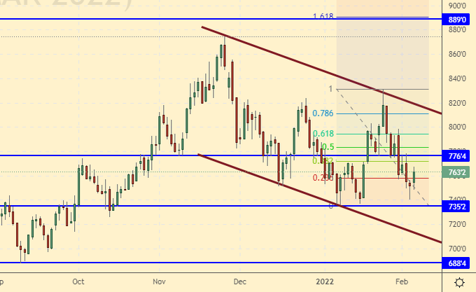 Сценарий роста: рассматриваем мартовский фьючерс, дата экспирации 10 марта. Рынок растет из-за непогоды в США. Нельзя исключать ход к 930.0. Покупать можно только на откате к 800.0.