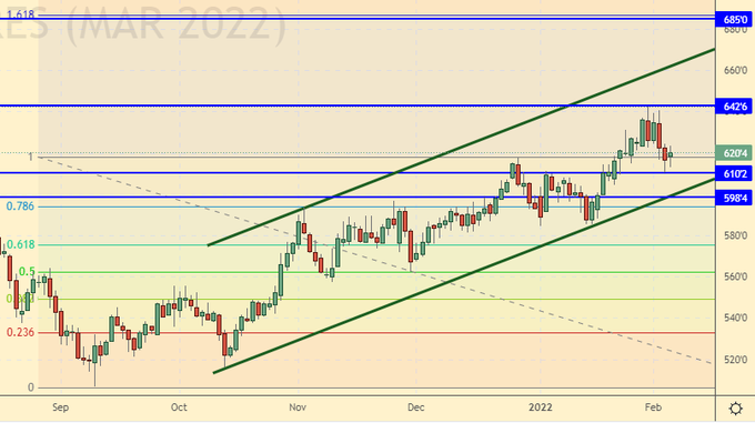 Сценарий роста: рассматриваем мартовский фьючерс, дата экспирации 14 марта. От уровня 600.0 можно войти в лонг. Текущие уровни приемлемы для покупок, но в меньшей степени.