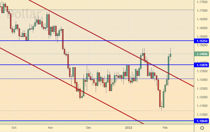 Сценарий роста: на фоне коррекции на российском рынке, в январе частные инвесторы решили нарастить лонги, и усердно несли на рынок свои золотые сольдо, скупая акции российских компаний. Однако, так как со стороны Запада истерия вокруг Украины пока не утихает, нам трудно рассчитывать на преобладание оптимистичных настроений на рынке. Предлагаем думать о покупках только после роста фьючерса выше уровня 160000, при этом внимательно анализируя новостной фон.