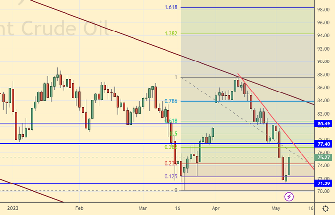 Сценарий роста: идеальным был бы лонг от 73.00. Однако, столь глубокого погружения может и не быть. Что делать? По текущим уровням покупать, при таком характере падения, не хочется. Будем ждать или 73.00, или какого-то прояснения ситуации.