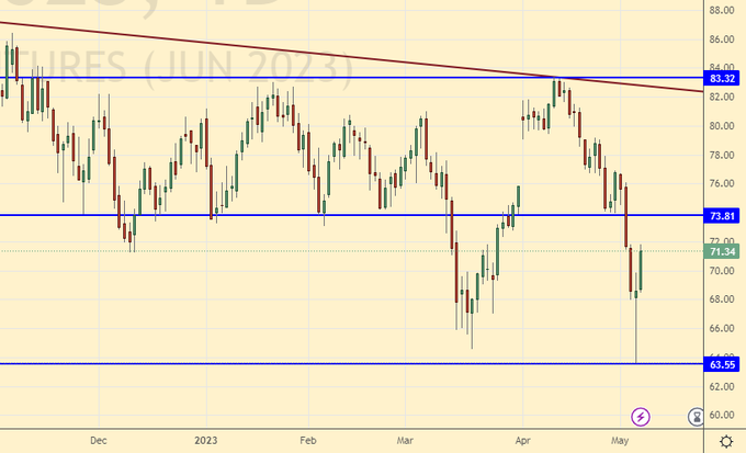 Продажа: нет. Кто в позиции от 86.50, перенесите стоп на 77.60. Цель: 66.67 долларов за баррель.