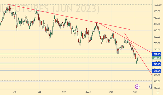 Сценарий падения: шорт от 700.0 в целом интересен, особенно если в пятницу USDA сообщит о перспективах получения хорошего урожая.