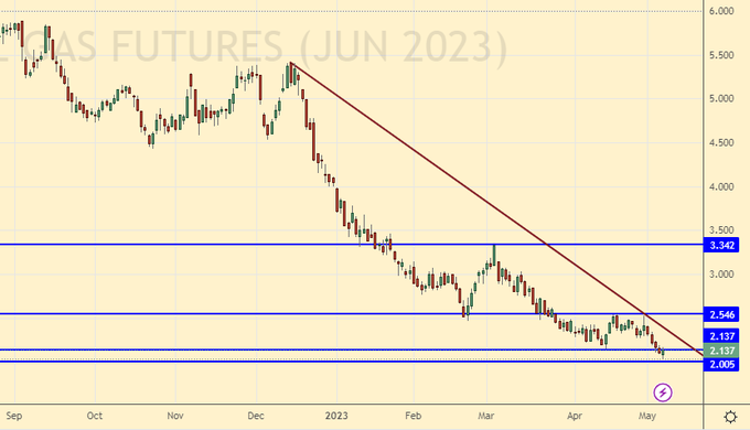 Сценарий роста: рассматриваем июньский фьючерс, дата экспирации 26 мая. В США взорвалось 20 заводов СПГ за последний год. Как странно. Здесь не важно почему это произошло. Скорее всего, в США газ будет дешевым, так как его не на чем сжижать, а вот в Европе он будет дорогим.