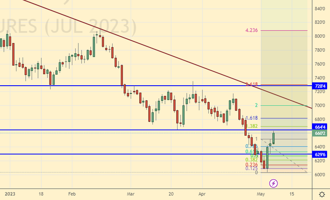 Сценарий роста: рассматриваем июльский фьючерс, дата экспирации 15 июля. Вы должны были зацепить рынок от 606.0. Теперь стоит стоять в лонге вплоть до 700.0, про более высокие уровни пока не говорим.