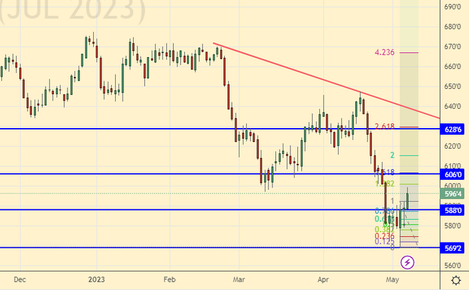 Сценарий падения: при подходе к 630.0 имеет смысл говорить о продажах. Если в пятницу перспективы от USDA по новому урожаю будут хорошие, то можно от обозначенного уровня войти в шорт.