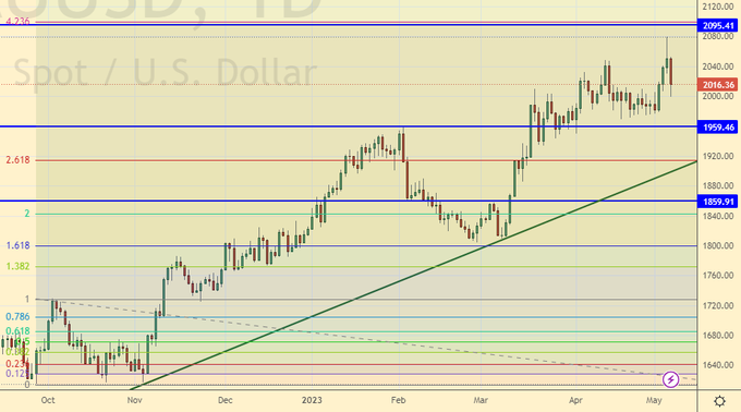 Сценарий падения: надо продавать. Американцы зальют проблемы с региональными банками деньгами. Никто не хочет допустить кризиса и паники. Золоту надо немного остыть. Отметим, что место для продажи не идеальное.
