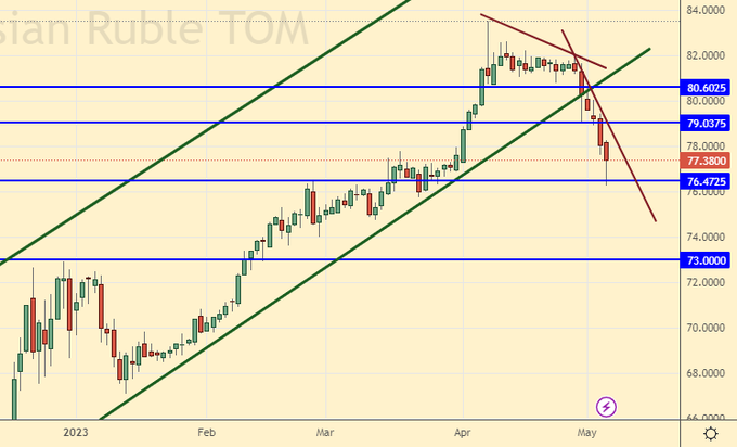Сценарий роста: рассматриваем майский фьючерс, дата экспирации 31 мая. Рынок ушел ниже 77.00. Сработал стоп-ордер. Пока воздержимся от покупок. Берем паузу.