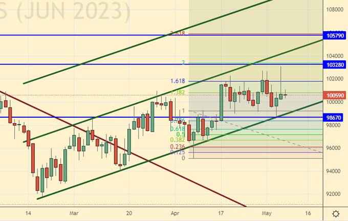 Сценарий роста: рассматриваем июньский фьючерс, дата экспирации 15 июня. Покупать с текущих уровней? Да. Несмотря на то, что нас выбило по стоп-ордеру, войдем снова. Ход вверх к 112000 пропускать нельзя.