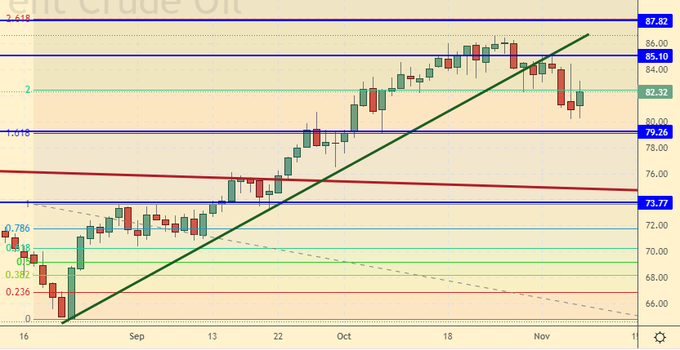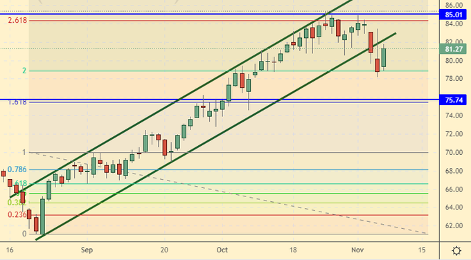 Сценарий роста: рассматриваем декабрьский фьючерс, дата экспирации 19 ноября. Прорыв выше 85.00 не будет сюрпризом. Рынок может спокойно пройти к 96.00 в текущих условиях.