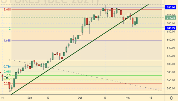 Сценарий роста: рассматриваем декабрьский фьючерс, дата экспирации 10 декабря. Если вырастем выше 750.00, будем покупать. Второй вариант – это покупать после падения к 620.00.