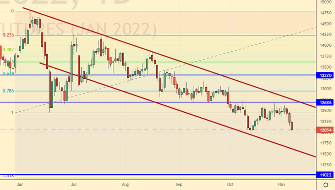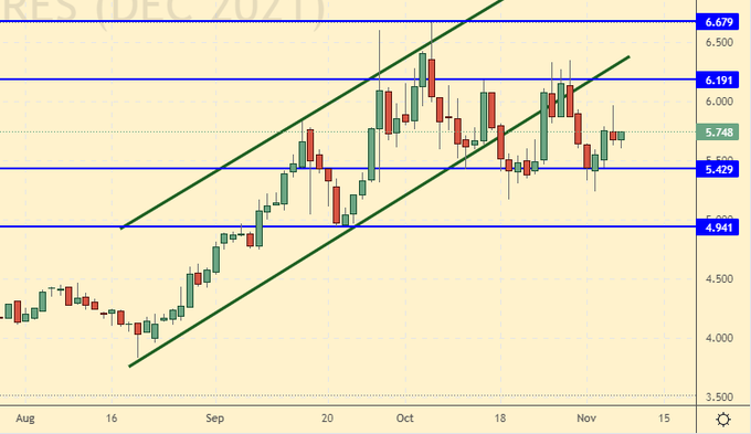 Сценарий роста: рассматриваем декабрьский фьючерс, дата экспирации 26 ноября. Продолжаем рекомендовать покупки. Цены на газ в Европе остаются высокими.
