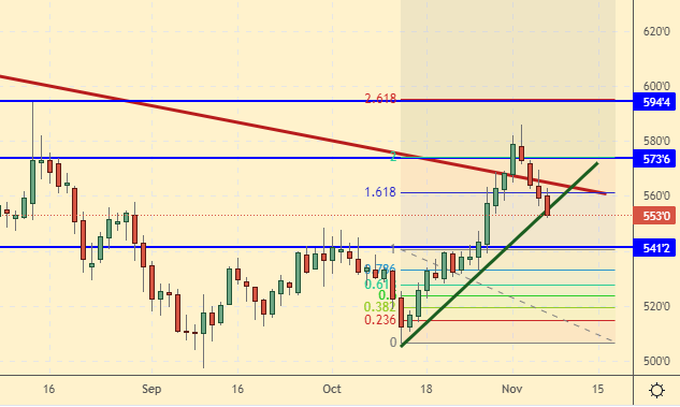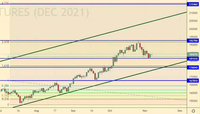Сценарий роста: рассматриваем декабрьский фьючерс, дата экспирации 14 декабря. Будем держать лонги, продолжая рассчитывать на ход к 600.0. Если цены упадут к 540.0, нарастим покупки.