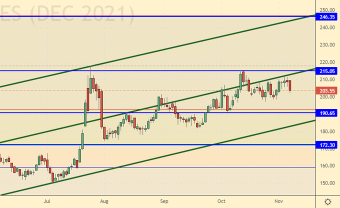 Сценарий роста: рассматриваем декабрьский фьючерс, дата экспирации 20 декабря. Есть опасность падения к 190.00 и ниже. Подтягиваем стоп-ордера. Новых позиций не открываем.