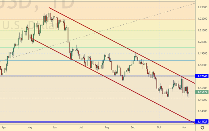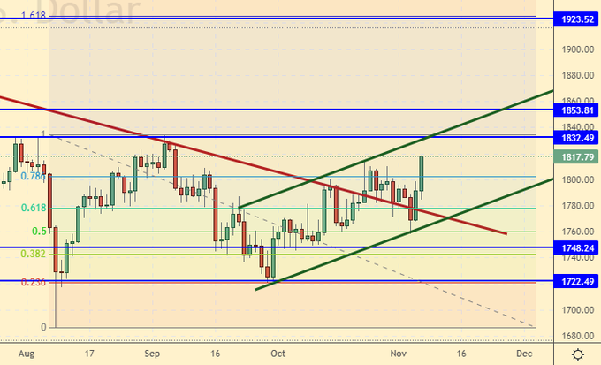 Мы не видим падения фондового рынка в США после заседания ФРС 3-го ноября, что говорит нам о том, что об усилении позиций доллара пока никто всерьез не задумывается. Дополнительным подтверждением слабости доллара выступают котировки золота, которые закрепились выше 1800 долларов за тройскую унцию.