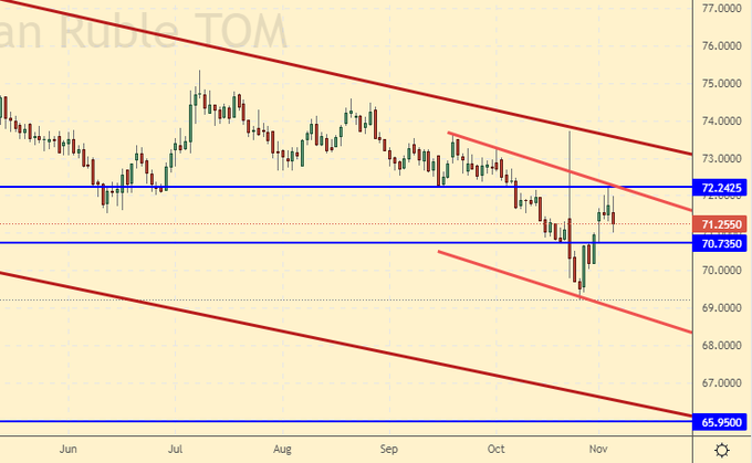 Сценарий роста: даже несмотря на то, что Минфин купит доллары в ноябре аж на 518 млрд. рублей, это может не помочь американской валюте. Мы начнем покупки пары только после роста выше 74.00.
