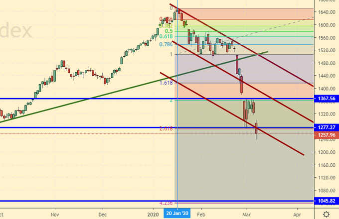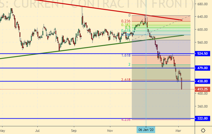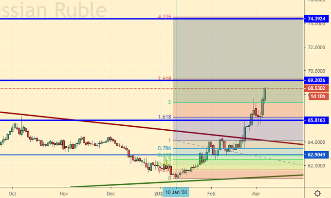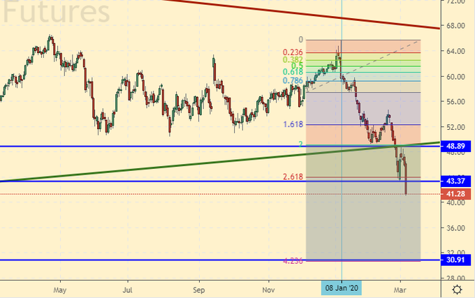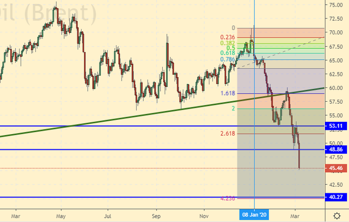 Никаких обязательств у сторон с 1-го апреля по сокращению добычи нет. Но, уже вчера, в субботу, зачем ждать дня дурака, КСА объявило о снижении отпускных цен на 6 – 7 долларов. А также анонсировали рост добычи. Сколько это будет: 10 млн. баррелей, 12 или 14, сказать просто невозможно. Может быть и все 20, пусть и через год. И всё это на фоне вируса.