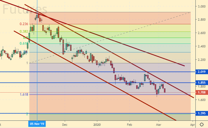 Сценарий роста: рассматриваем апрельский фьючерс с датой экспирации 27 марта. Кто вошел в лонг от 1.75 – стойте. Однако, учитывая перспективы падения цен на нефть шансов на выживание позиции немного.