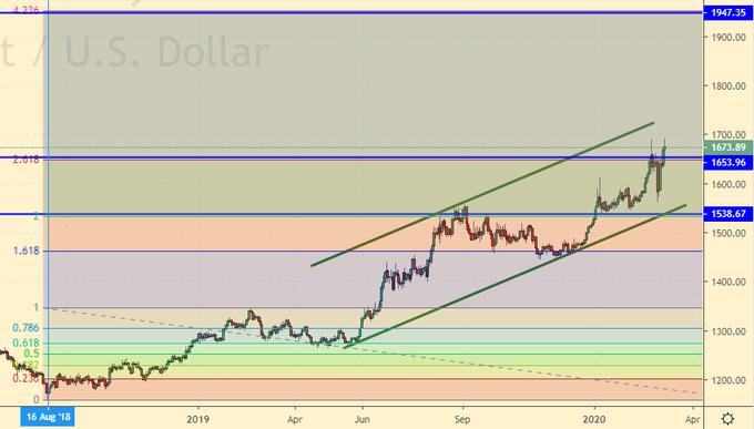 Сценарий роста: «в районе 1540 можно покупать», писали мы ранее и не ошиблись. Перспективы у золота просто колоссальные. Ход на 1940 виден вооруженным уровнями Фибо глазом. После подъема выше 1700 можно нарастить лонг.