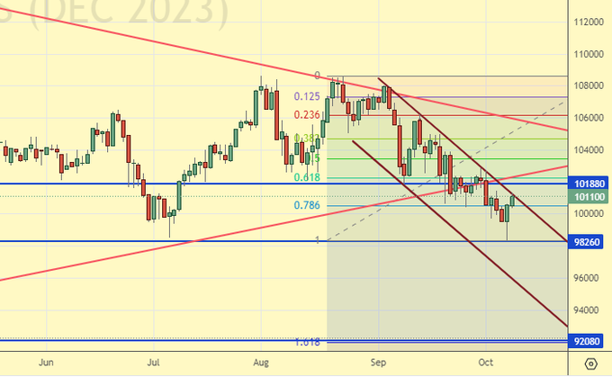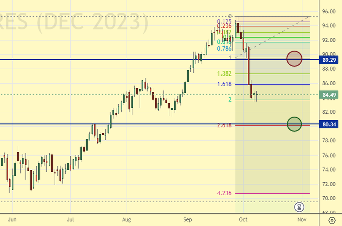 Сценарий роста: рассматриваем ноябрьский фьючерс, дата экспирации 30 ноября. Сюрприз. Упали сильно. От 80.50 будем покупать. Вероятно, что нас ждет волатильная неделя на рынке нефти из-за атаки на Израиль.