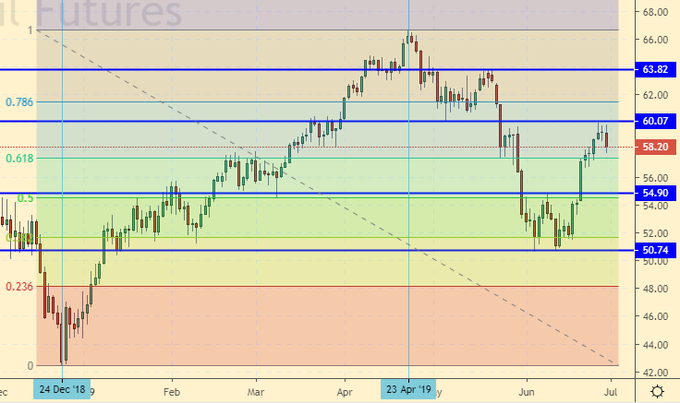 Сценарий роста: рассматриваем августовский фьючерс, дата экспирации 22 июля. Выполнили цель на 59.90. Теперь ждем откат к 55.00. Но надо следить за тем, как резко будет реагировать рынок на сообщения из Вены. Если соглашения о сокращении не будет, можем пасть и на пять долларов за день.