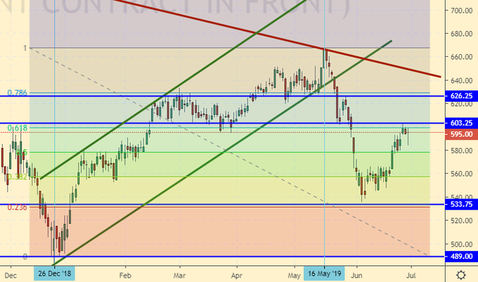 Сценарий роста: рассматриваем июльский фьючерс, дата экспирации 11 июля. Как и предполагали, боремся на 600.0. Если пройдем выше, это бычий джек-пот. Так как дальше у нас 640.0, а затем и 700.0 в случае пробоя линии сопротивления.