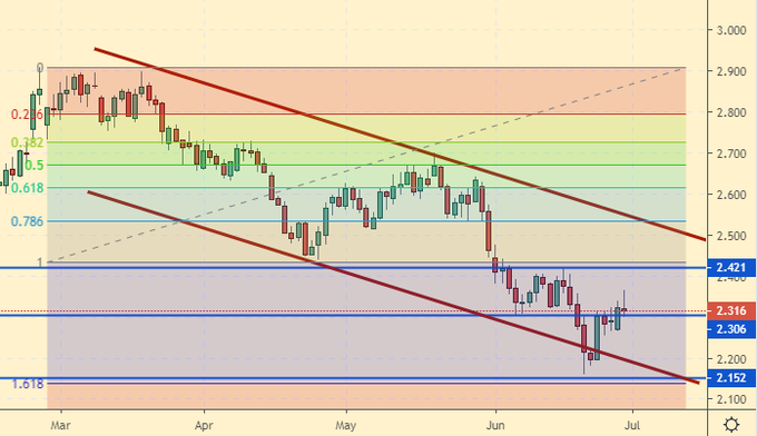 Сценарий роста: рассматриваем августовский фьючерс с датой экспирации 29 июля. Быки пока выглядят неубедительно. Ждем роста выше 2.40 для того, чтобы только начать думать о развороте тренда вверх.