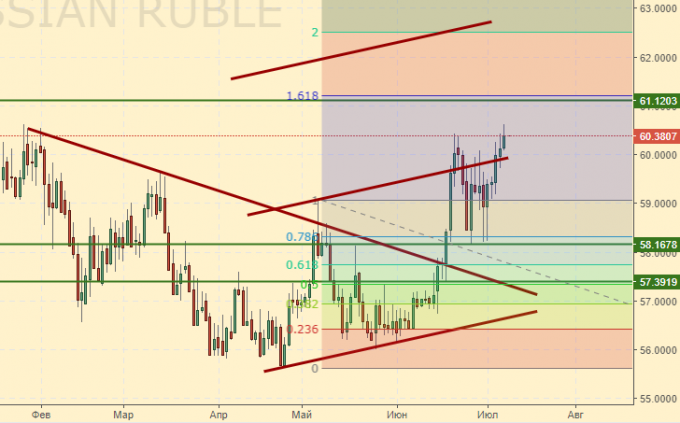 Сценарий падения: видим, как от 58.00 рубль усиленно продавали, что в конечном счете должно вытолкнуть рынок к 61.00. А вот дальше возможны варианты. По нефти есть шансы на рост к 55.00, они на данный момент отнюдь не потеряны, что в случае реализации такого сценария создаст предпосылки для возврата пары доллар/рубль к 56.00. Если же роста цен на нефть не будет, а по телевизору и дальше будут пугать 20%-м ростом цен на капусту и кабачки, нагнетая, так сказать, нужные настроения, то действительно, падение рубля может продолжиться и уровень 61.00 не станет препятствием.