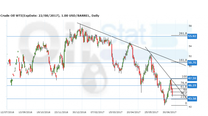 Сценарий роста: рассматриваем сентябрьский фьючерс с датой экспирации 22 августа. Наш план вверх остается прежним. В начале 55.00, затем 65.00. Несмотря на то, что стоп на 44.20 был сбит, мы продолжим бороться, так как более интересных уровней для покупки может не быть долгое время. Поэтому, снова покупаем.