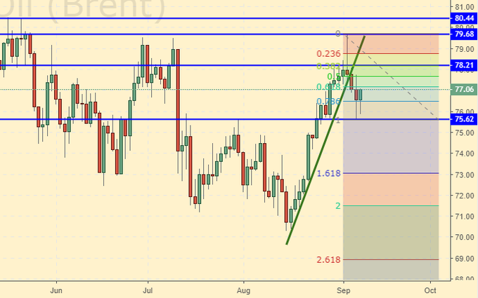 Сценарий роста: рассматриваем ноябрьский фьючерс, дата экспирации 28 сентября. Рынок не смог взять 80.00 сходу и откатил. Это предполагалось, так как рост на позапрошлой неделе был сильным, накопилась техническая перекупленность, которая должна была найти выход в виде коррекции и фиксации прибыли. Теперь, после хода на 76.00 все готово для того, чтобы продолжать восходящее движение.