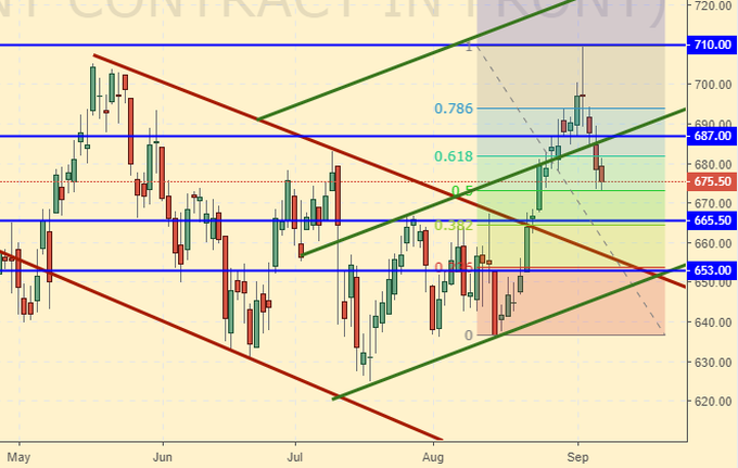 Сценарий роста: рассматриваем октябрьский фьючерс, дата экспирации 11 октября. Увидели новый максимум на 710.00. Однако, после этого быки были отброшены назад. У уровня 665.00 на следующей неделе может быть борьба, и быки в ней должны одержать победу, иначе все встанет с ног на голову. Будем продолжать удерживать стоп на 660.00, рассчитывая на новые максимумы в будущем.