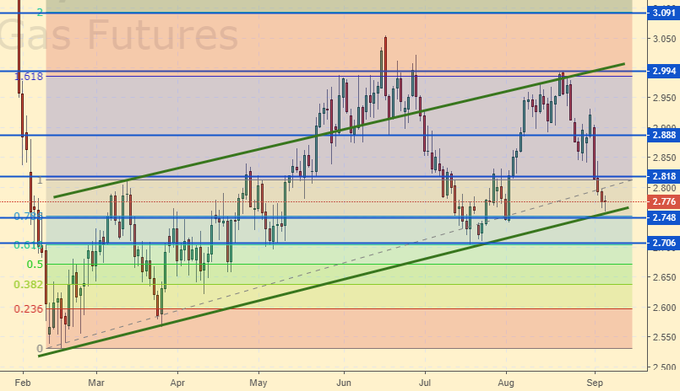 Сценарий роста: рассматриваем октябрьский фьючерс с датой экспирации 26 сентября. Его Величество не захотело не захотело расти и свалилось. Но свалилось к нижней границе растущего канала. Здесь надо покупать. Стоп рядом. Рассчитываем на то, что цены останутся в растущем канале.