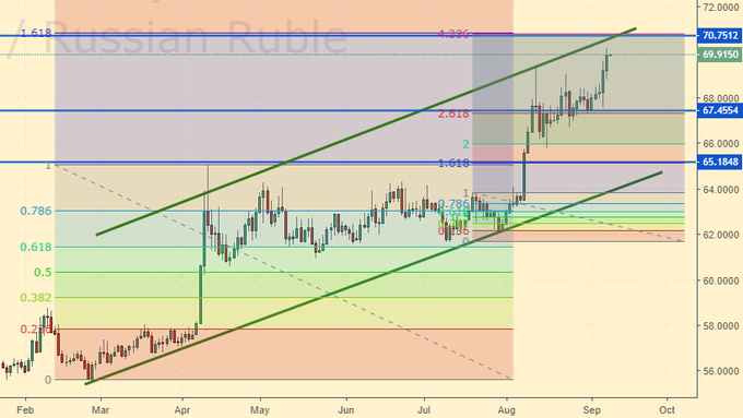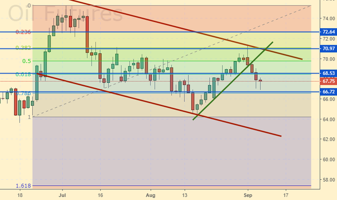 Сценарий роста: рассматриваем октябрьский фьючерс, дата экспирации 20 сентября. Откат оказался несколько более глубоким, чем это предполагалось нами неделю назад, тем не менее, ситуация для покупок остается вполне благоприятной. Можно подождать взятия уровня 68.50 после чего можно входить в лонг.