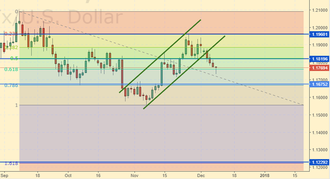 Сценарий роста: кое-как отпихнув покупателей от 1.1960, продавцы утратили темп и теперь им придется не сладко. Так как если в преддверии объявления решения по ставке ФРС США 13-го декабря падения нет, то после того как данные будут опубликованы, пропихнуть рынок вниз будет еще сложнее. Если цены вырастут выше 1.1820, быки вновь завладеют инициативой. Именно этот уровень и является ключевым вопросом следующей недели. После роста выше 1.1820, ищем возможности для покупок. Наверху у нас 1.2360.