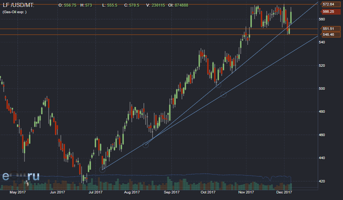 Сценарий роста: рассматриваем февральский фьючерс, дата экспирации 28 декабря. Начавшийся было откат от 64.40, нашел поддержку на 61.07, после чего рынок вновь рванул вверх в четверг и пятницу. Что называется, только успевай уворачиваться. Если быки смогут пройти выше 64.40, то откроется отметка 69.00, в противном случае нас может ждать спуск не к 59.30, как мы писали ранее, а к 58.00. За неудачный штурм надо платить. Платить более глубоким откатом.