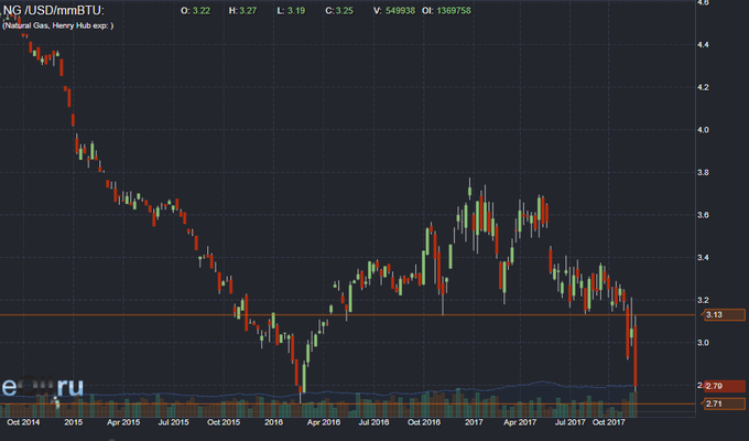Сценарий роста: рассматриваем февральский фьючерс с датой экспирации 29 января. Смотрим на недельные свечи и историю изменений цен за 3 года. Хм, перед нами обвал, о котором писалось на прошлой неделе, так как погода в США стоит теплая. Слишком теплая для того чтобы росло потребление газа. Про покупки в такой ситуации писать смысла нет.
