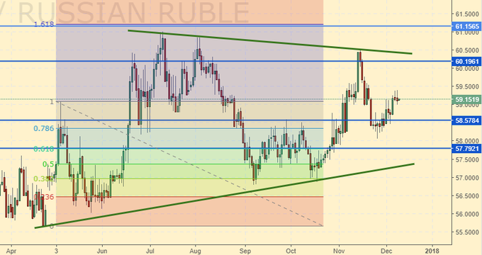 Сценарий падения: продолжаем утверждать, что пока рынок находится ниже 60.00 у медведей есть все шансы продолжить давление. Консолидация так или иначе приближает нас к какой-то развязке, но для того чтобы у рывка вверх или вниз был потенциал, выход из этой консолидации должен произойти до Нового Года в противном случае, мы уйдем в неопределенность. Если рынок упадет ниже 58.40 – ищите возможности для продажи.