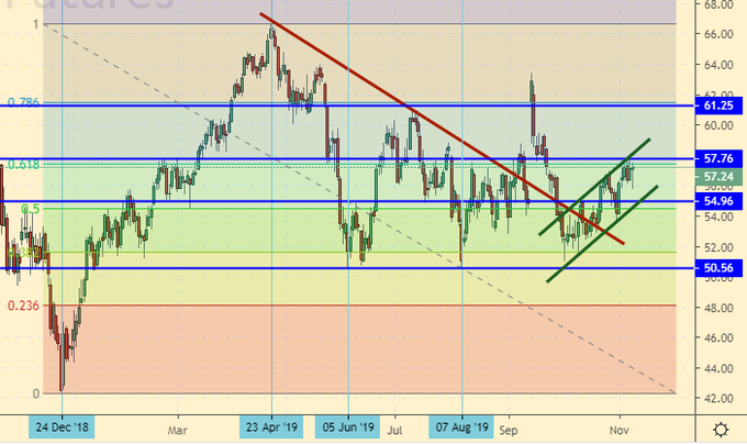 Сценарий роста: рассматриваем декабрьский фьючерс, дата экспирации 20 ноября. Рынок всю неделю продержался на локальном максимуме. Продолжим покупать в расчете на то, что мы уйдем к 61.20, а возможно и выше.