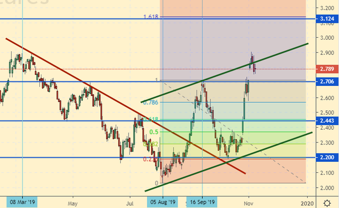 Сценарий роста: рассматриваем декабрьский фьючерс с датой экспирации 26 ноября. Продолжаем стоять высоко, без намека на коррекцию. Есть предпосылки к тому, что запасы газа в США не достигнут максимумов прошлого года. Отставание не критичное, но все же. Держим лонги.